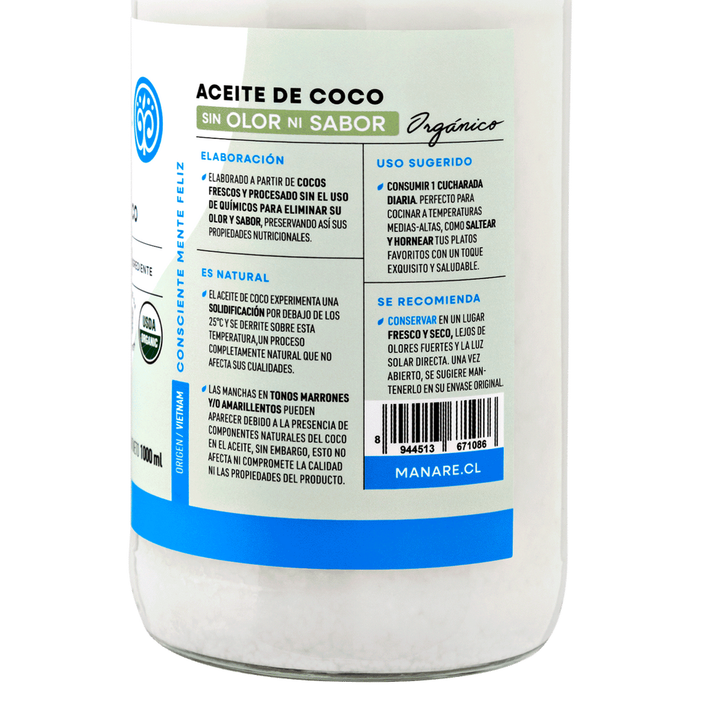 Aceite de Coco Orgánico Sin Olor Ni Sabor 1 LT Sin Gluten - Manare