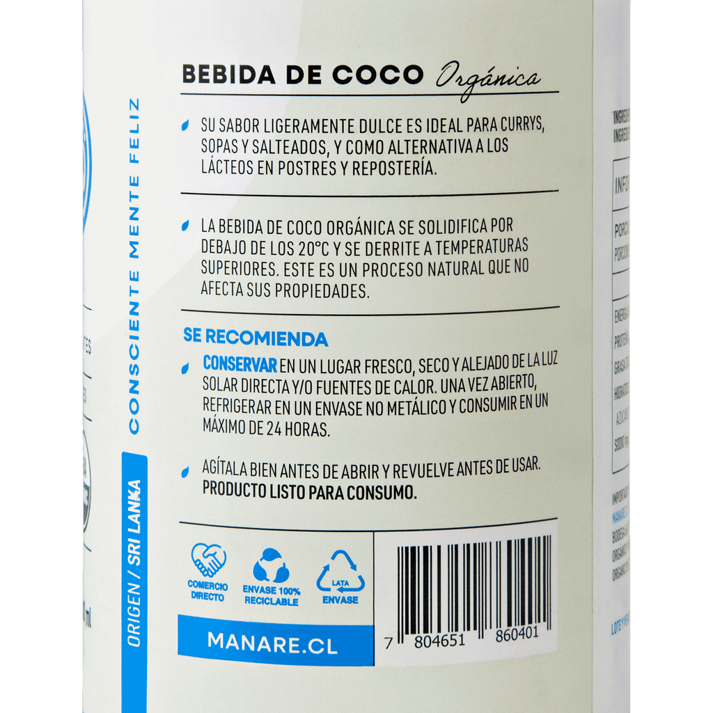 La Bebida de Coco Orgánica Manare está elaborada a partir de cocos frescos (Cocos nucifera), con solo 2 ingredientes: extracto de coco orgánico y agua.