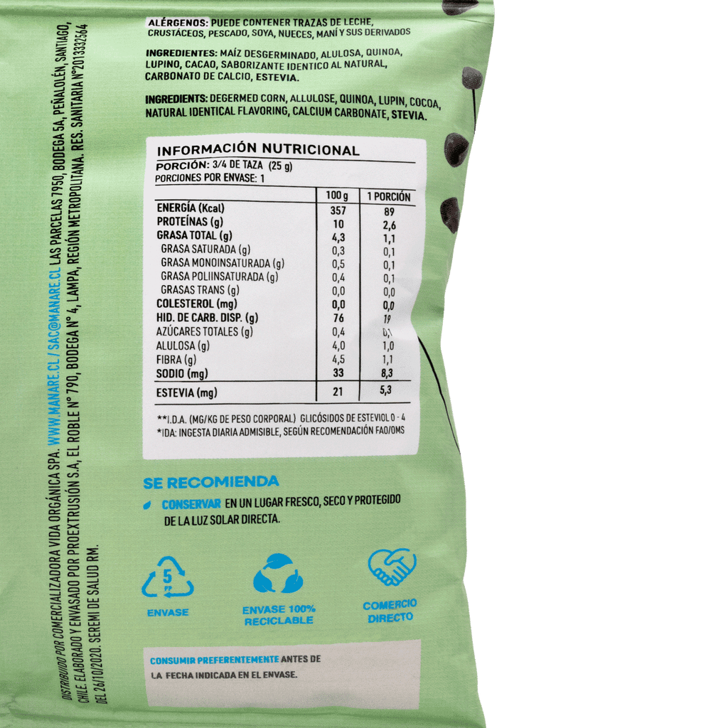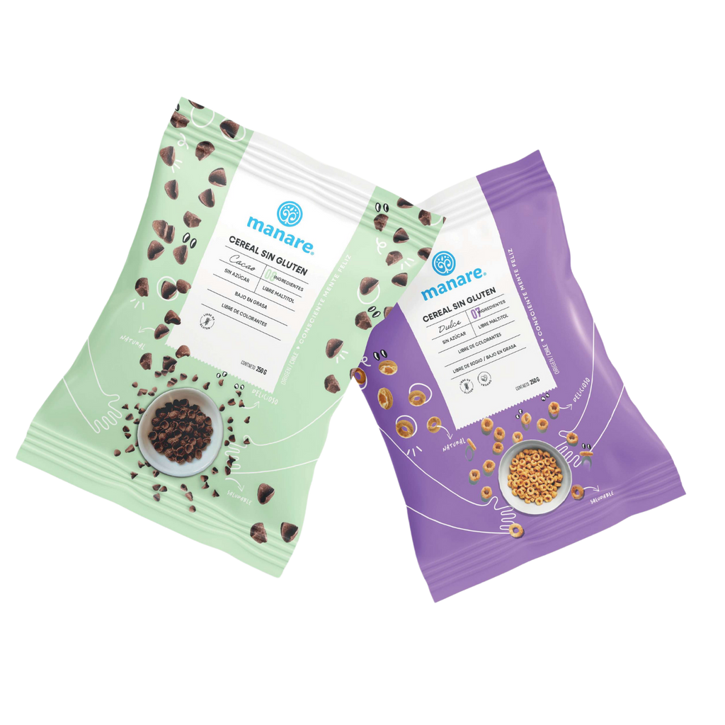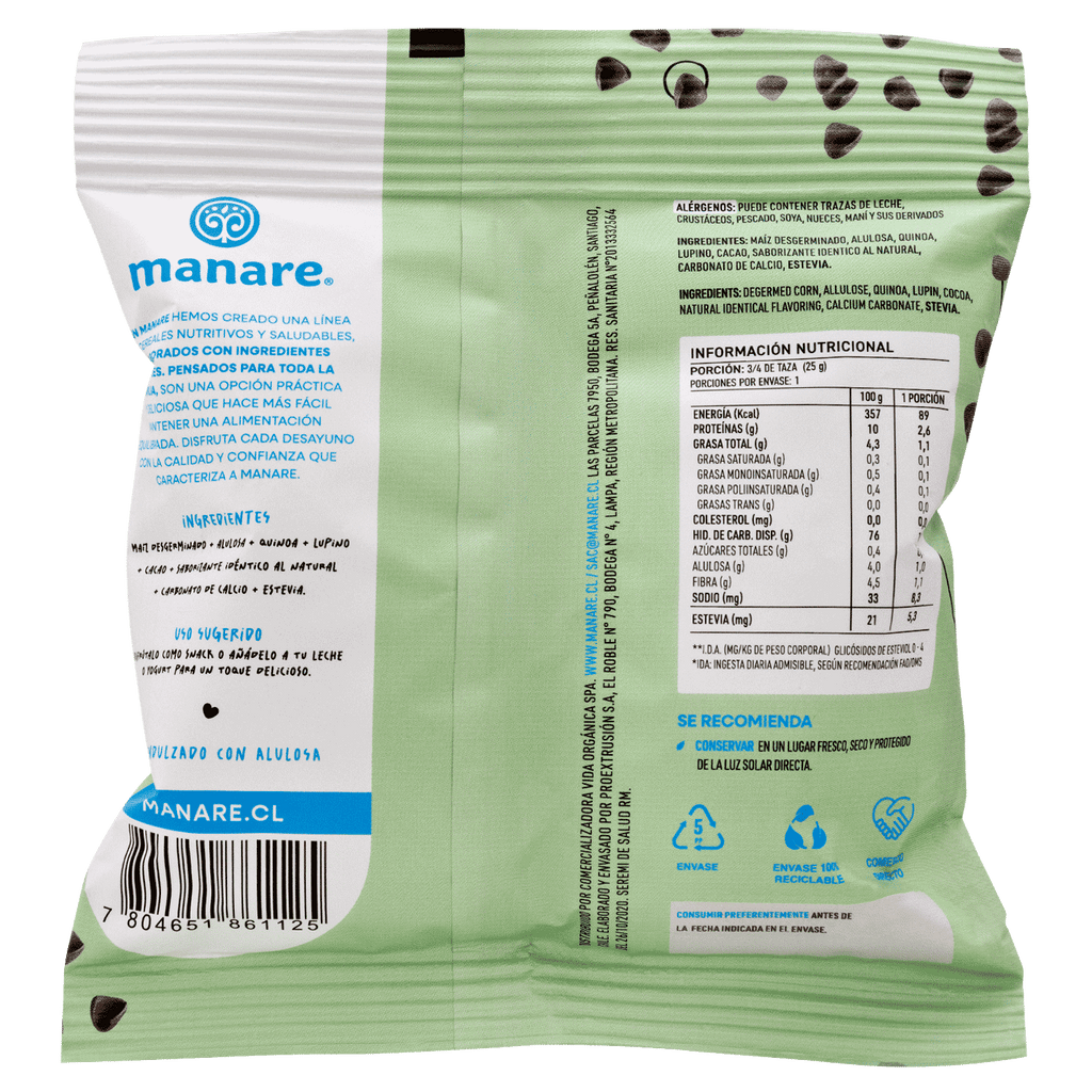El Cereal Sin Gluten Cacao Manare es una opción consciente y saludable para disfrutar en el desayuno o como snack. Elaborado con maíz desgerminado, quínoa, lupino y cacao, endulzado con alulosa y estevia, y libre de azúcares añadidos, sucralosa y colorantes. ¡Un sabor equilibrado que encantará a toda la familia!