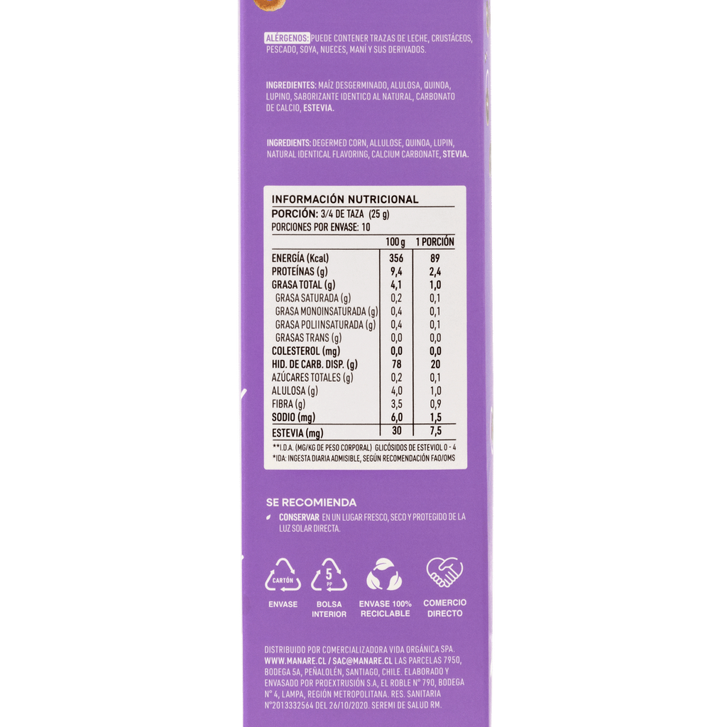 Ingredientes: Maíz desgerminado, alulosa, quínoa, lupino, saborizante idéntico al natural, carbonato de calcio, estevia.