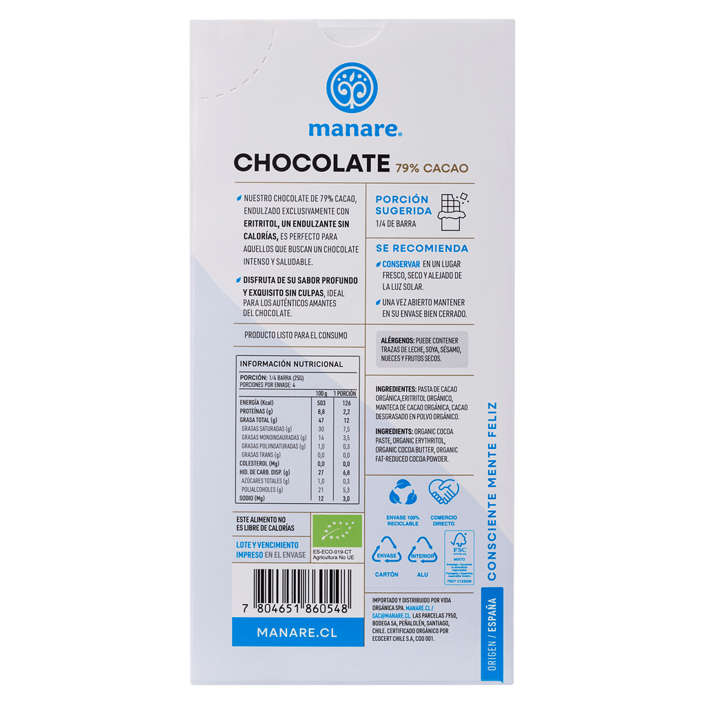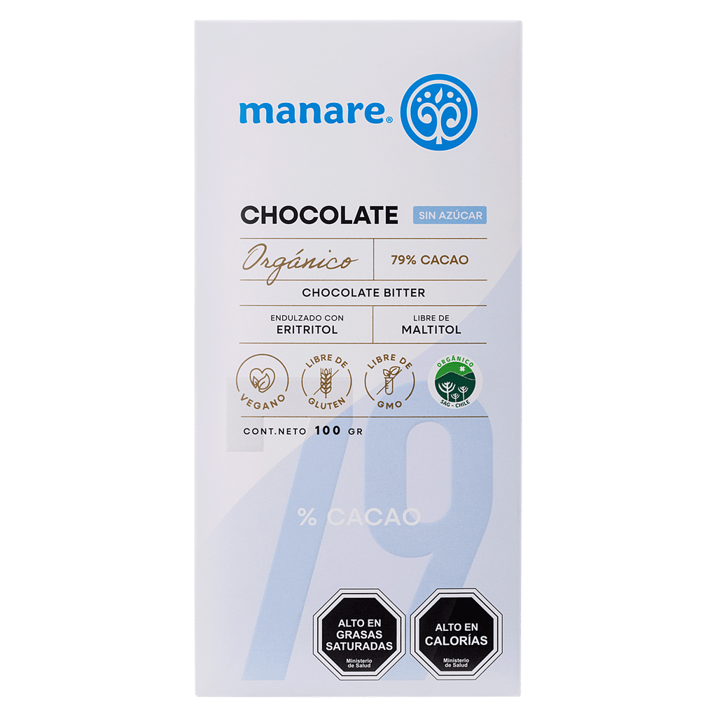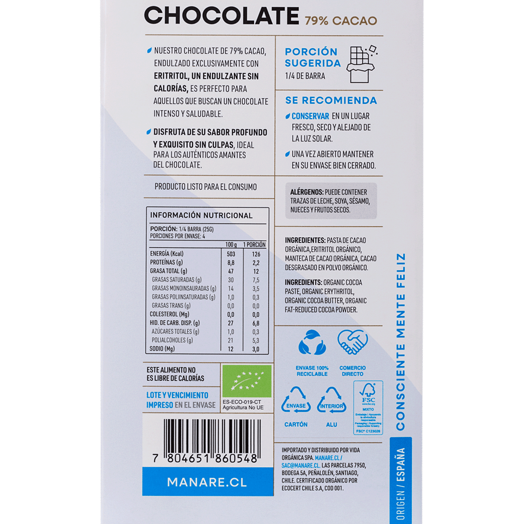 Chocolate Sin Azúcar Orgánico 79% Cacao 100gr Sin Gluten - Manare