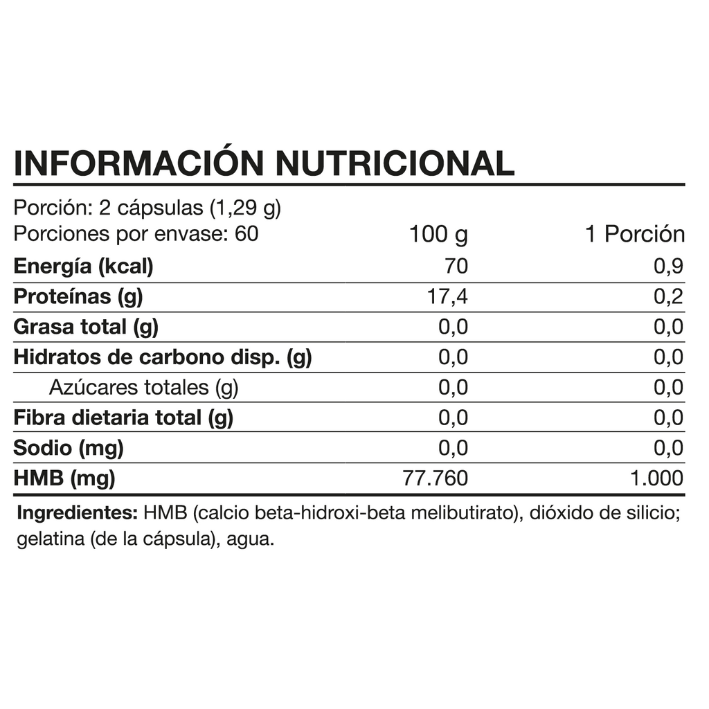 Cada porción aporta 1000 mg de HMB (β-hidroxi-β-metilbutirato), un metabolito derivado de la leucina ampliamente utilizado en nutrición deportiva por su rol en el mantenimiento del tejido muscular, especialmente en entrenamientos exigentes o periodos de alta carga.