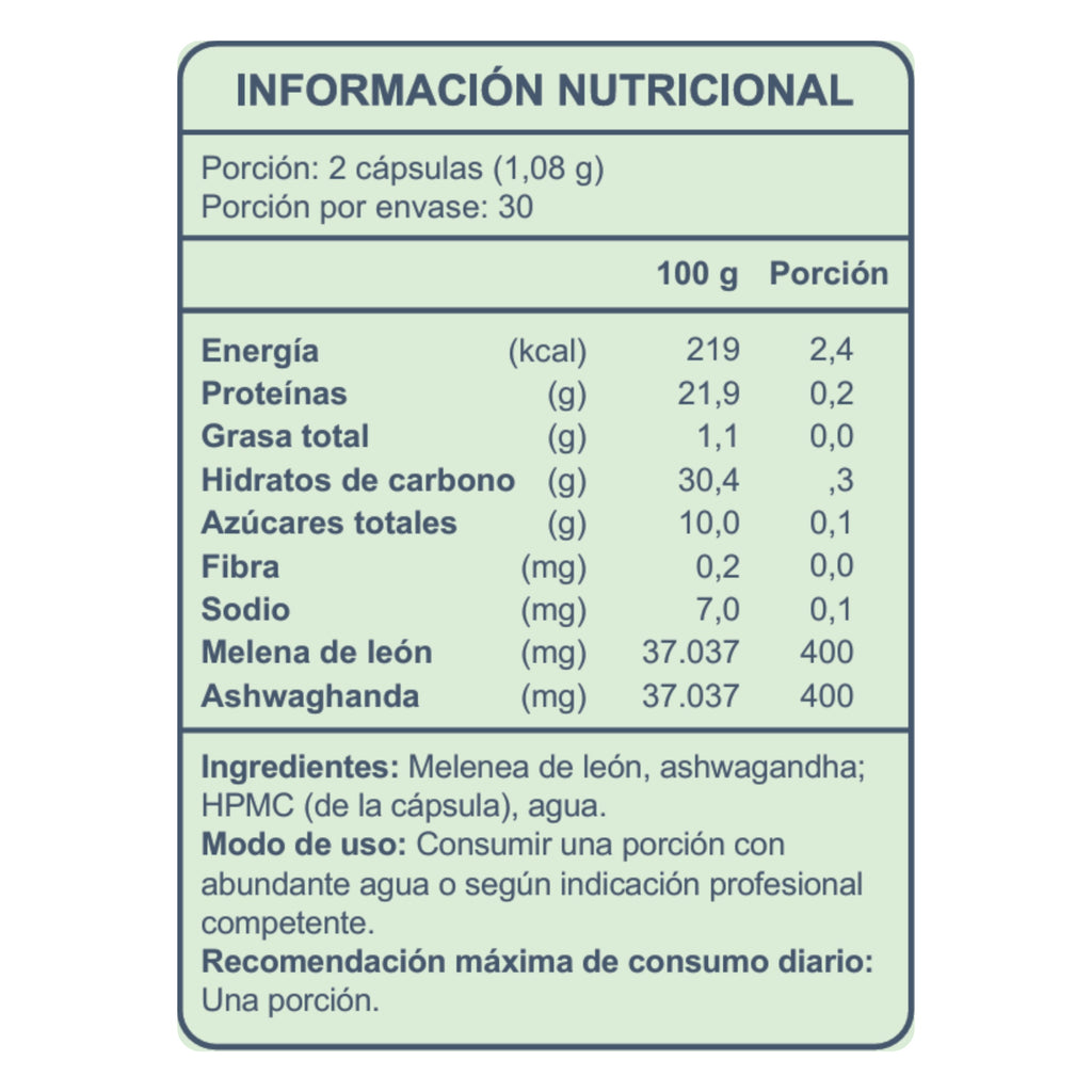 Melena + Ashw (Melena de León 400mg + Ashwagandha 400mg) – 60 Cápsulas Vegetales (1 mes) – FNL