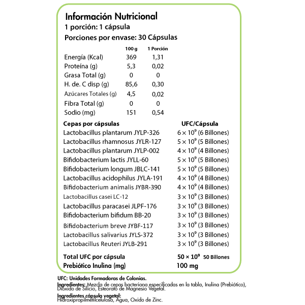 Cada cápsula aporta un total de 50 x 10⁹ UFC, distribuidas en las siguientes cepas:
