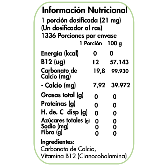La porción declarada es de 12 µg de Vitamina B12, correspondiente a 1 cucharita dosificadora.